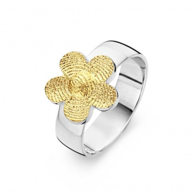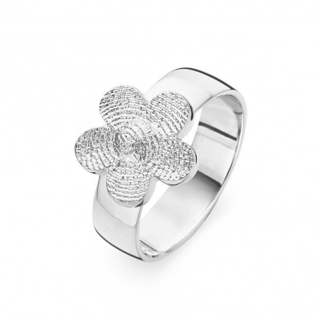 The Bliss 5 ring is an appr. 6mm wide ring, with an appr. 12.5mm flower shaped partial pawprint cushion relief. These rings are available in the versions shown below.