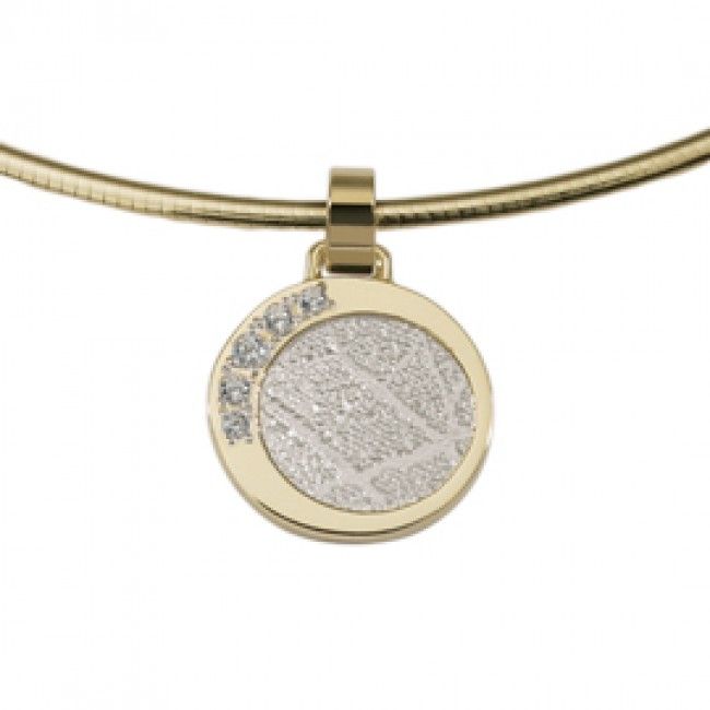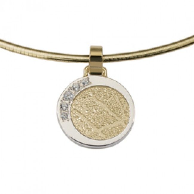 The Dazzling is a round pendant of about 16 mm with an asymmetric edge, which can be provided with a part of a footprint. Brilliant: 2×0.01 2×0.02 1×0.03 or zircon.