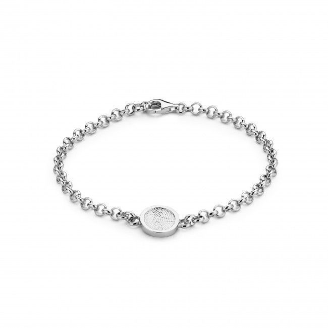 Bliss Round Fingerprint Bracelet is an appr. 2.5mm wide and 18cm long bracelet, with appr. 9mm round with fingerprint, or an appr. 4mm wide and 18cm long bracelet, with appr. 12mm round with fingerprint.