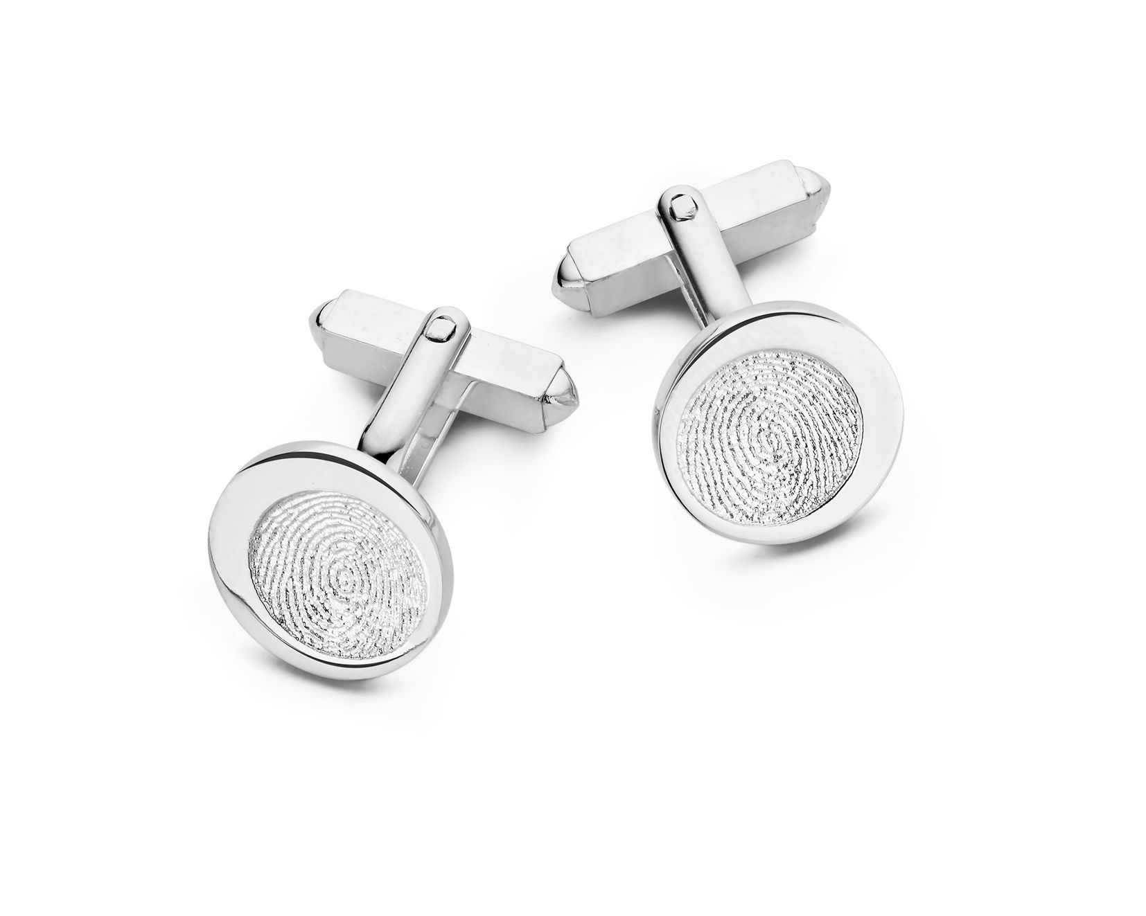 The Precious is a round cufflink of appr. 16 mm with an asymmetric edge, which can be provided with one or two different fingerprints. These cufflinks are available in the versions shown below.
