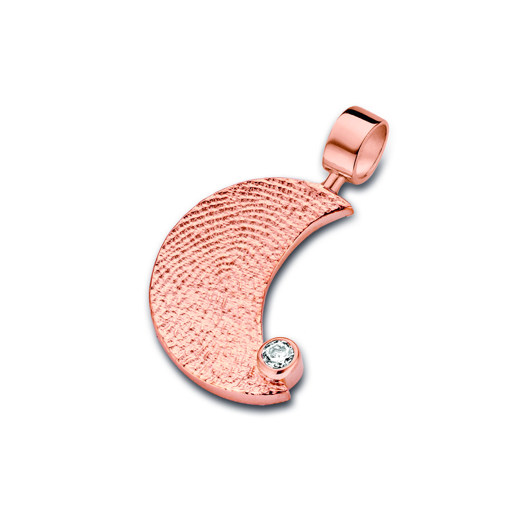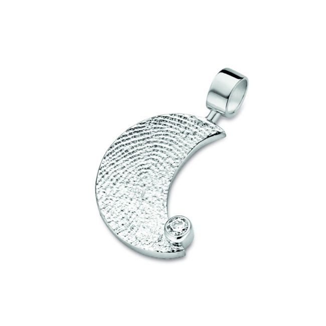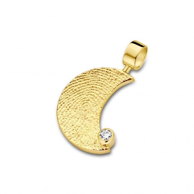 The Moon is a lunar shaped pendant of about 16 mm, which can be provided with a fingerprint. Gold version with diamond cut: 0.05 carat or a 2.5mm zirconia, in silver with a 2.5mm zirconia.